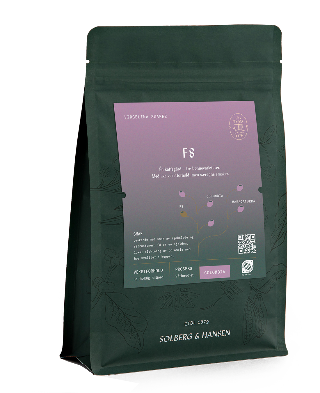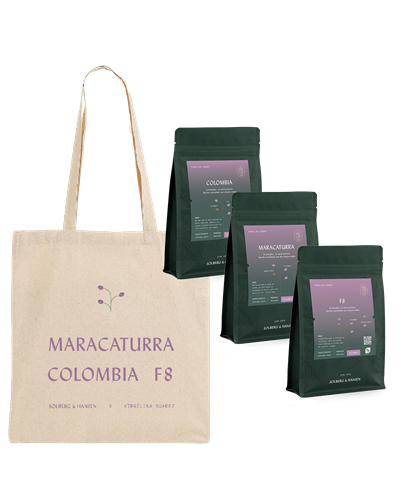 Sammen med den kvalitetsbevisste kaffebonden Virgelina Suarez lanserer vi tre ulike og helt unike kaffepartier fra hennes gård El Triunfo i Planadas i Colombia. Tre kaffepartier med tre ulike bønnevarieteter; maracaturra, colombia og F8. Alle med like vekstforhold og prosessering, men med særegne smaksnoter. Smak kaffene mot hverandre, og opplev de ulike nyansene fra hver bønnetype.