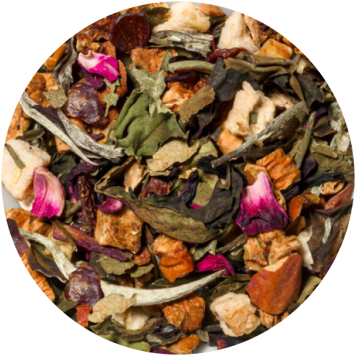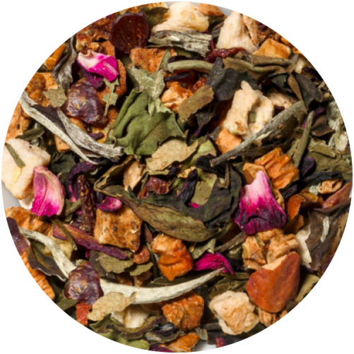 Ingredienser: Eplebiter, hibiskus, nypeskall, hvit te (Pai Mu Tan), bjørnebærblader, aroma, sitrusskall, hylleblomst, ferskenbiter (fersken, sukker).