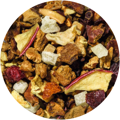 Ingredienser: Eplebiter, ananasbiter (ananas, sukker, sitronsyre), nypeskall, karamellbiter (sukker, kondensert melk, glukosesirup, helmelkspulver), pærebiter, aroma, sitrusskall, kanel, epleskiver, rips. Allergener: Melk