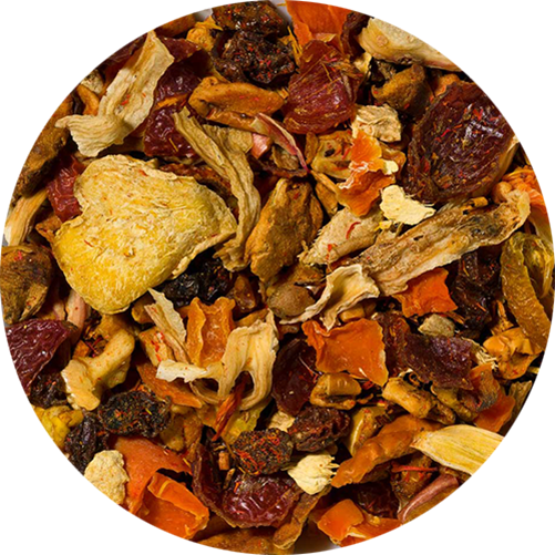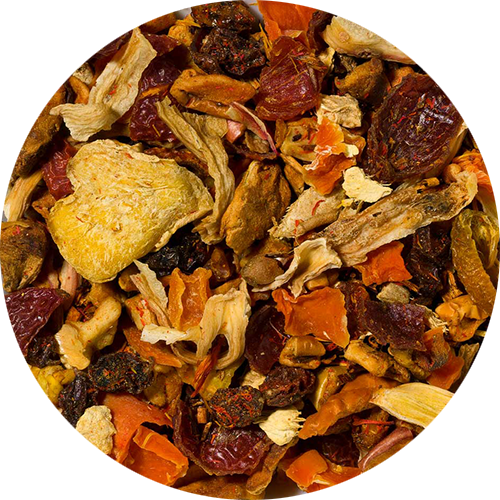 Ingredienser: eplebiter, nypeskall, rooibos, tindvedbær, gulrotbiter, hvit hibiskus, ingefær, ingefærskiver, naturlig sitrusaroma, gulrotskiver, safrantistelkronblader, aroma.