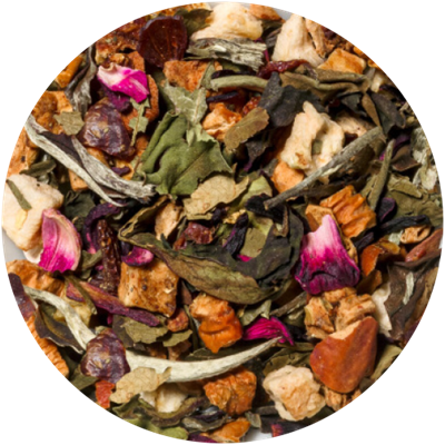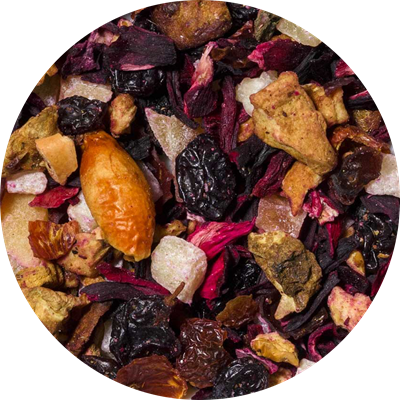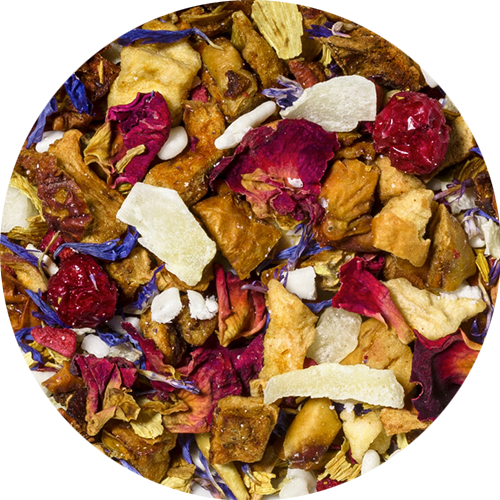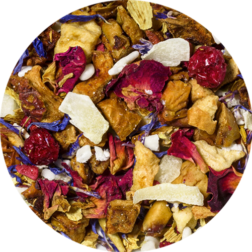 Ingredienser: Eplebiter, ananasbiter (ananas, sukker, sitronsyre), kakaosmørbiter (sukker, kakaosmør, dekstrose), ristede kokosflak, aroma, rips, roseblader, bringebærbiter, solsikkeblader, sitronsyre, kornblomstblader. Kan inneholde spor av melk.