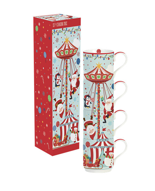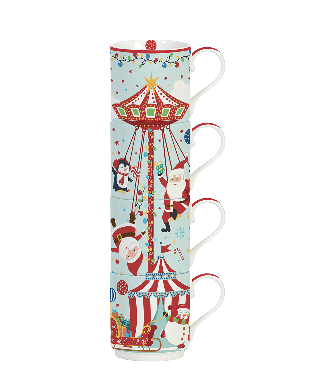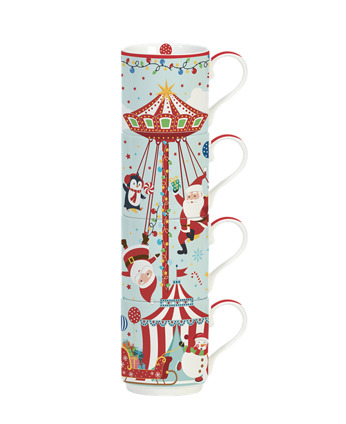 Sett med fire stk porselenskopper med julemotiv. Koppene kan stables oppå hverandre.