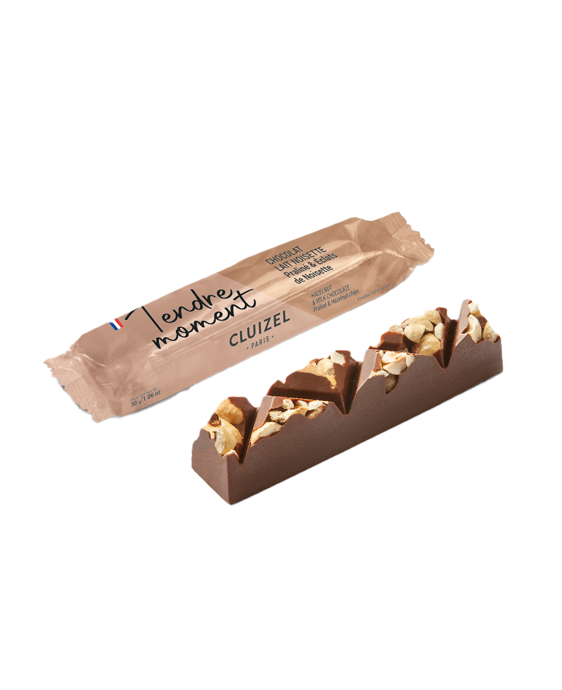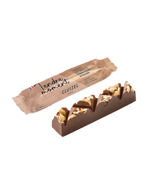 En liten sjokoladebar med eksklusive smaker fra Cluizel som passer perfekt til kaffekoppen. Tendre Moment er en silkemyk melkesjokolade fylt med pralin og toppet med knuste hasselnøtter.