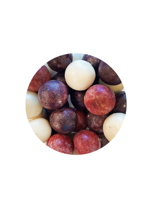 Bringebær med lakris: En spennende kombinasjon av syrlig bringebærsaus og flytende lakris, pakket inn i søt, hvit sjokolade.