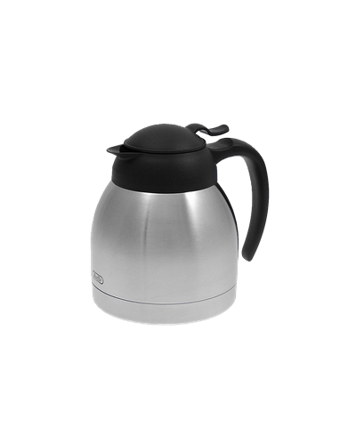 Termokanne i børstet stål og sort plast, med knapp på toppen for å åpne/lukke.